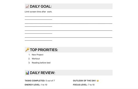Next, define your focus . What do you really want to get out of your daily reviews? Are you trying to boost your productivity at work? Improve your mental well-being? Learn a new skill? Build better relationships? Trying to track everything at once can be overwhelming. Instead, pick one or two key areas to focus on initially. This might mean tailoring your prompts to specifically address these areas. For example, if your focus is productivity, your prompts might revolve around tasks completed, challenges faced, and time management. If it’s mental well-being, you might focus on mood, gratitude, and moments of stress or calm. Having a clear focus will make your reviews more targeted and meaningful, and it will help you see progress more clearly in the areas that matter most to you right now. You can always broaden your scope later, but starting with a clear intention is crucial for building a solid foundation.