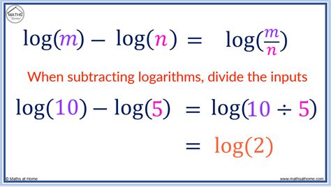 • Quotient Rule: Similar to the product rule, but for division. If you’re dividing inside the logarithm, you can rewrite it as the difference of two logarithms. This one is defined as logb(x/y) = logb(x) - logb(y) . It’s great for simplifying fractions within logarithms.