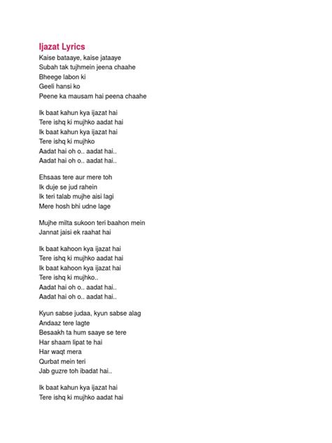 Let’s get into the nitty-gritty of what the lyrics for “Ijazat” female version are actually saying. Often, these lyrics revolve around themes of love’s permission, or the asking for it. It’s a beautiful concept, isn’t it? Imagine needing an “ijazat” – a formal permission – not just to be with someone, but to love them fully, to express the depths of your heart, or even to dream of a future together. This isn’t about weakness; it’s about the immense value placed on the other person’s feelings and their willingness to reciprocate . The female singer might be expressing a deep longing, a desire for a bond that is not just accepted but actively embraced. The lyrics often speak of shared experiences, the quiet moments that build a relationship, and the profound impact one person can have on another’s life. You might hear lines that describe how the beloved’s presence brings light into darkness, or how their voice is a soothing balm. It’s the kind of love that makes you feel like you can conquer anything, or conversely, the kind that makes you feel incredibly vulnerable and exposed, yet safe. The request for “ijazat” can be seen as an affirmation of the partner’s agency and the desire for a relationship built on mutual respect and open communication. It highlights a mature understanding of love, where consent and acknowledgement are paramount. It’s not just about falling in love; it’s about being allowed to love, and wanting that love to be recognized and reciprocated. The imagery used in the lyrics is often poetic, painting pictures of moonlit nights, whispered secrets, and the profound silence that speaks volumes between two souls. It’s about the small gestures that mean the world, and the big dreams that are shared in hushed tones. The female perspective can bring a unique tenderness to these themes, emphasizing the gentle strength and resilience of love, and the deep emotional investment that comes with it. It’s a beautiful portrayal of how love can empower and transform, and how the simple act of asking for and receiving “Ijazat” can solidify an unbreakable bond. The song speaks to that universal human desire for connection, for acceptance, and for the freedom to love without reservation, all while respecting the boundaries and feelings of the one you hold dear. It’s a testament to the power of asking, and the beauty of being granted permission to share one’s heart.