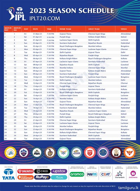 • Check for Schedule Changes: Occasionally, the schedule may be subject to change due to unforeseen circumstances. Keep an eye on the official IPL website and sports news channels for any updates or changes to the time table.