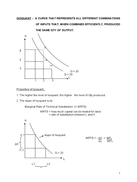 • Shape: Typically a convex curve (bowed inwards towards the origin), getting further from the origin as output increases. The slope of the isoquant (the Marginal Rate of Technical Substitution, or MRTS) shows how much of one input can be substituted for another while keeping output constant.