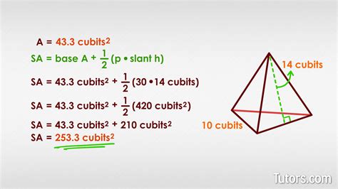 Let’s say you have a triangular pyramid where the base triangle has a base length of 6 cm and a height of 4 cm. The area of this base would be $ \( \frac{1}{2} \times 6 \text{ cm} \times 4 \text{ cm} = 12 \text{ cm}^2 \) $. It’s super important to keep your units straight here; if your lengths are in centimeters, your area will be in square centimeters.