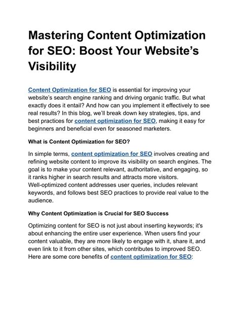 The benefits of dedicating time and effort to content optimization are truly staggering. First off, you’ll experience a significant increase in organic visibility . This means more eyes on your brand, more potential customers, and a stronger online presence without having to constantly pay for ads. Secondly, it leads to higher engagement rates . When your content is well-structured, easy to read, and directly answers user questions, people are more likely to spend time on your page, share it, and even link back to it, which further boosts your SEO. Thirdly, and perhaps most importantly for businesses, optimized content drives better conversion rates . When you attract users who are genuinely interested in what you offer, they’re much more likely to take the desired action, whether that’s making a purchase, signing up for a newsletter, or requesting a demo. It’s a virtuous cycle, really. Good optimization brings more traffic, more traffic leads to more engagement and conversions, and these positive signals tell search engines that your content is valuable, pushing you even higher in the rankings. Don’t underestimate the power of showing up on that coveted first page, guys – it’s where the magic happens for real digital growth. So, if you’re serious about your online success, prioritizing content optimization isn’t just an option; it’s a non-negotiable requirement.