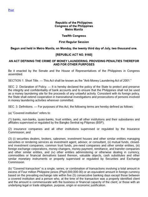 Hey guys! Let’s dive into something super important for our country: Republic Act 9160 , also known as the Anti-Money Laundering Act of 2001 . This law is a big deal because it’s designed to fight against those shady financial crimes that can really hurt our economy and our society. Think of it as the Philippines’ shield against dirty money and the criminals who try to hide it.