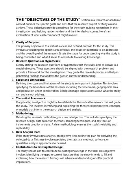 Finally, study objectives pave the way for future research and practical application . The findings derived from achieving your objectives can highlight new questions, identify limitations in current knowledge, or suggest areas for further investigation. They form the foundation for subsequent studies. For example, if your study objective was to assess the efficacy of a new therapy, and you successfully demonstrate its efficacy, the next logical step might be to explore its long-term effects or compare it with existing treatments. Similarly, the knowledge gained from achieving study objectives can inform policy decisions, guide interventions, or improve practices in a specific field. They are the building blocks for progress. The impact of research often extends far beyond the initial study, and clear objectives ensure that this impact is channeled effectively towards meaningful advancements.