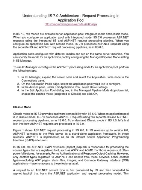 Moreover, application pools allow you to configure various settings, such as the .NET Framework version, the identity under which the application runs, and the process model settings. Each application pool can be configured independently, allowing you to optimize performance and security for each web application. By isolating applications into separate pools, you can prevent one application from consuming excessive resources and impacting the performance of other applications. Proper configuration of application pools is essential for maintaining a stable and responsive web server environment.